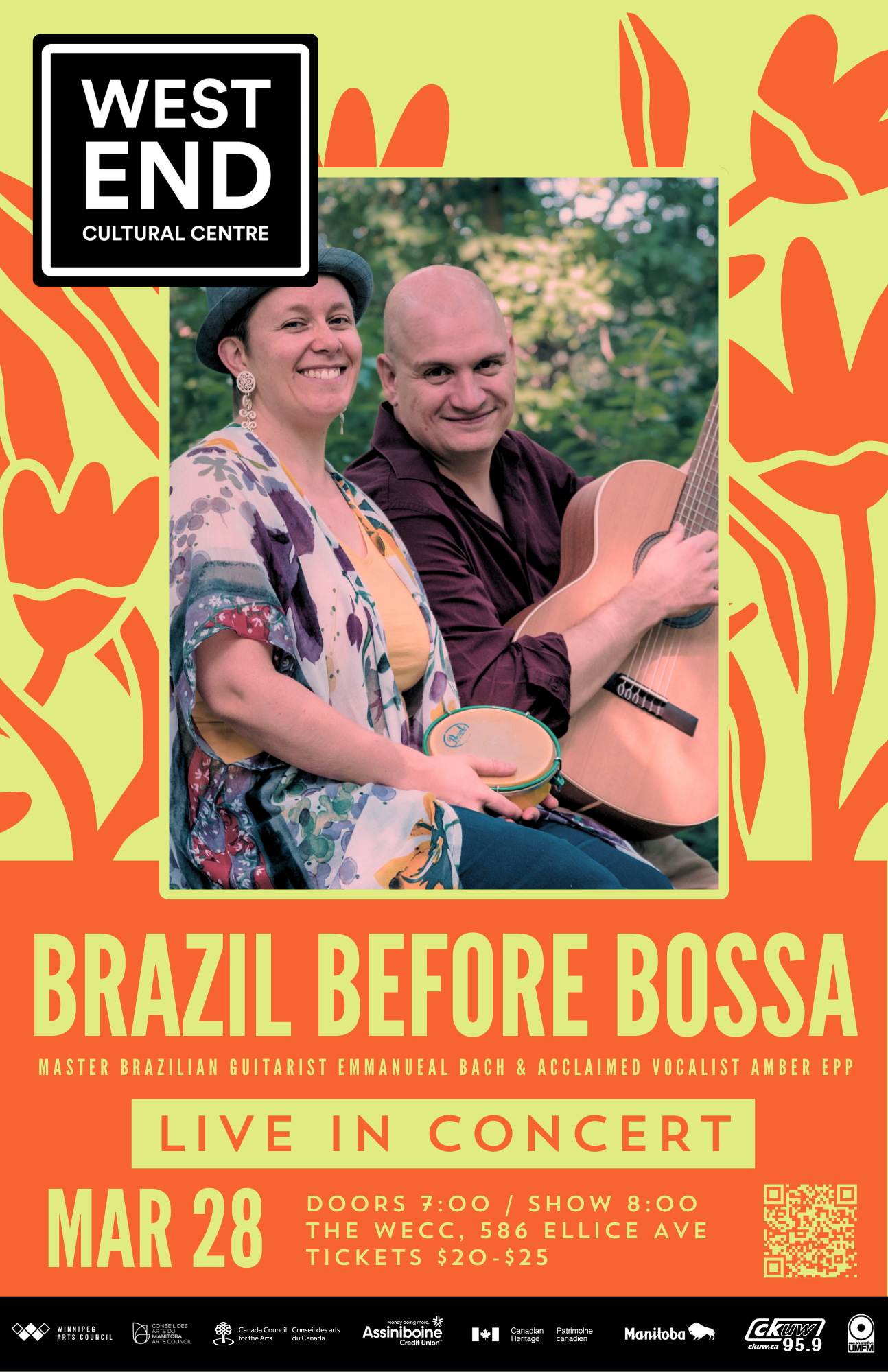 Travel through the foundational rhythms of choro, the exultant samba era, and the golden age of samba-canção, all before arriving at the iconic sounds of bossa nova. With Emmanuel’s authentic mastery of the guitar and cavaquinho, and Amber’s captivating Portuguese vocals, this concert is a passionate exploration of Brazilian cultural history.