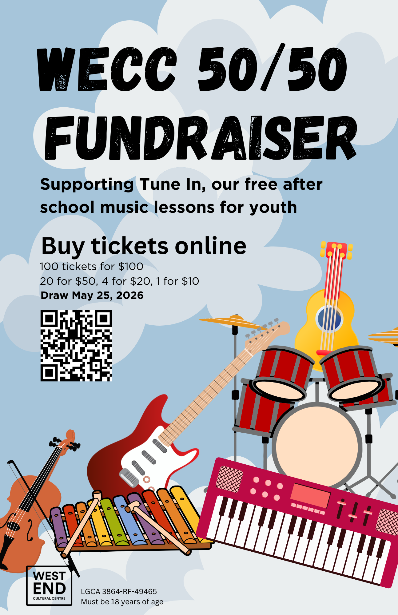 The 50/50 Raffle supports WECC community programming like The Tune-In Music Program. Tune In has been an integral part of the West End Cultural Centre for almost as long as the WECC has been around. We offer free music instruction on the guitar, bass, drums, voice, and songwriting for youth ages 8-18, in partnership with the Manitoba Conservatory of Music and Art. Tune In is one of the ways The WECC supports our neighbourhood, and young artists at the very start of their careers.