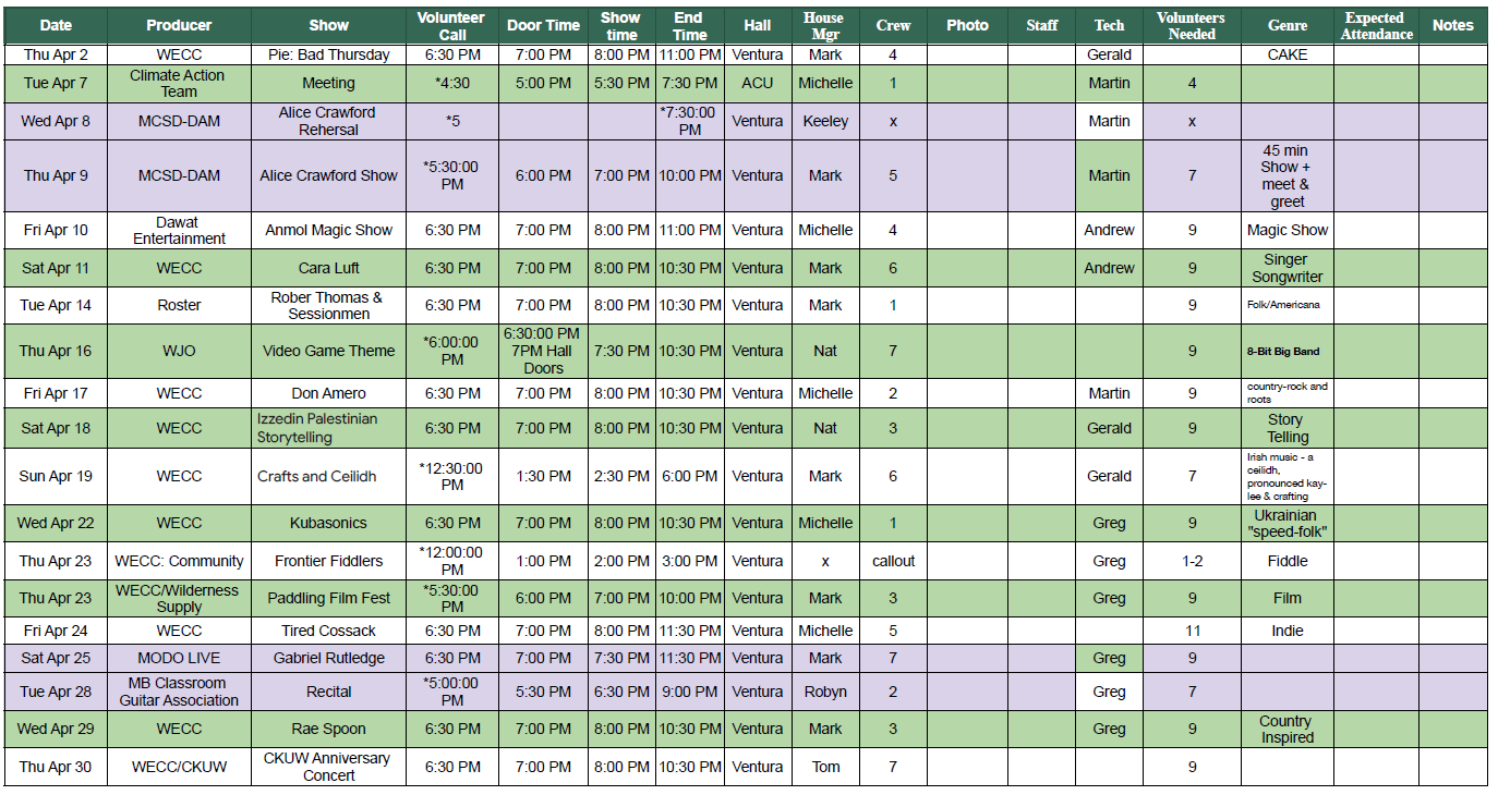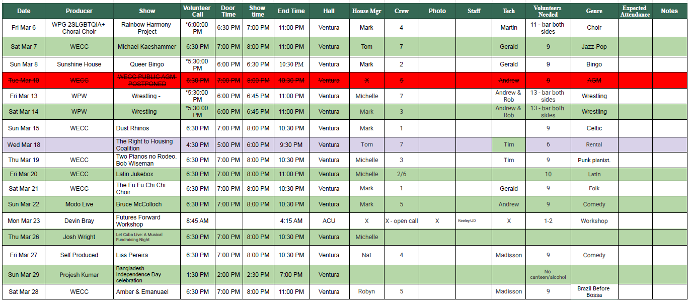 NEW SHOWS ADDED MARCH 26 & 29! Please Contact Keeley to volunteer those dates.